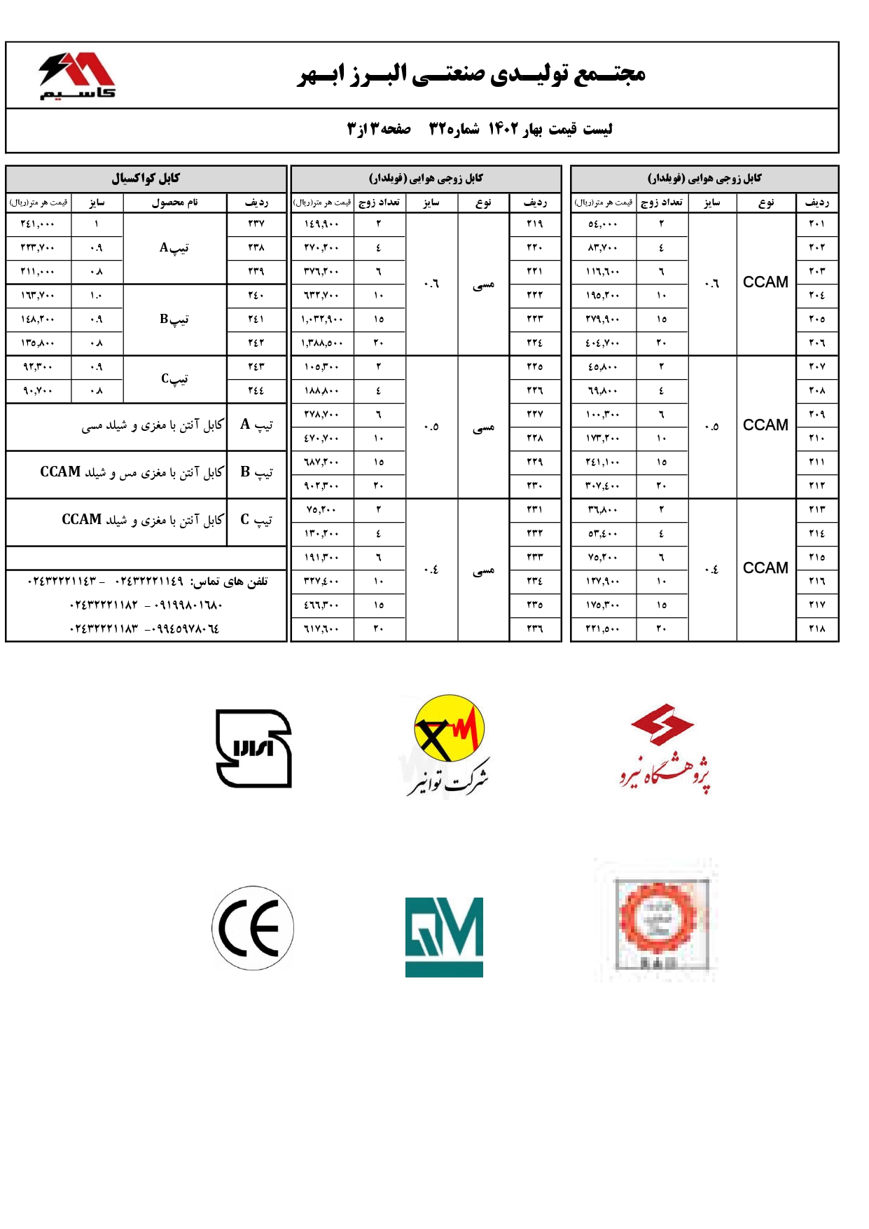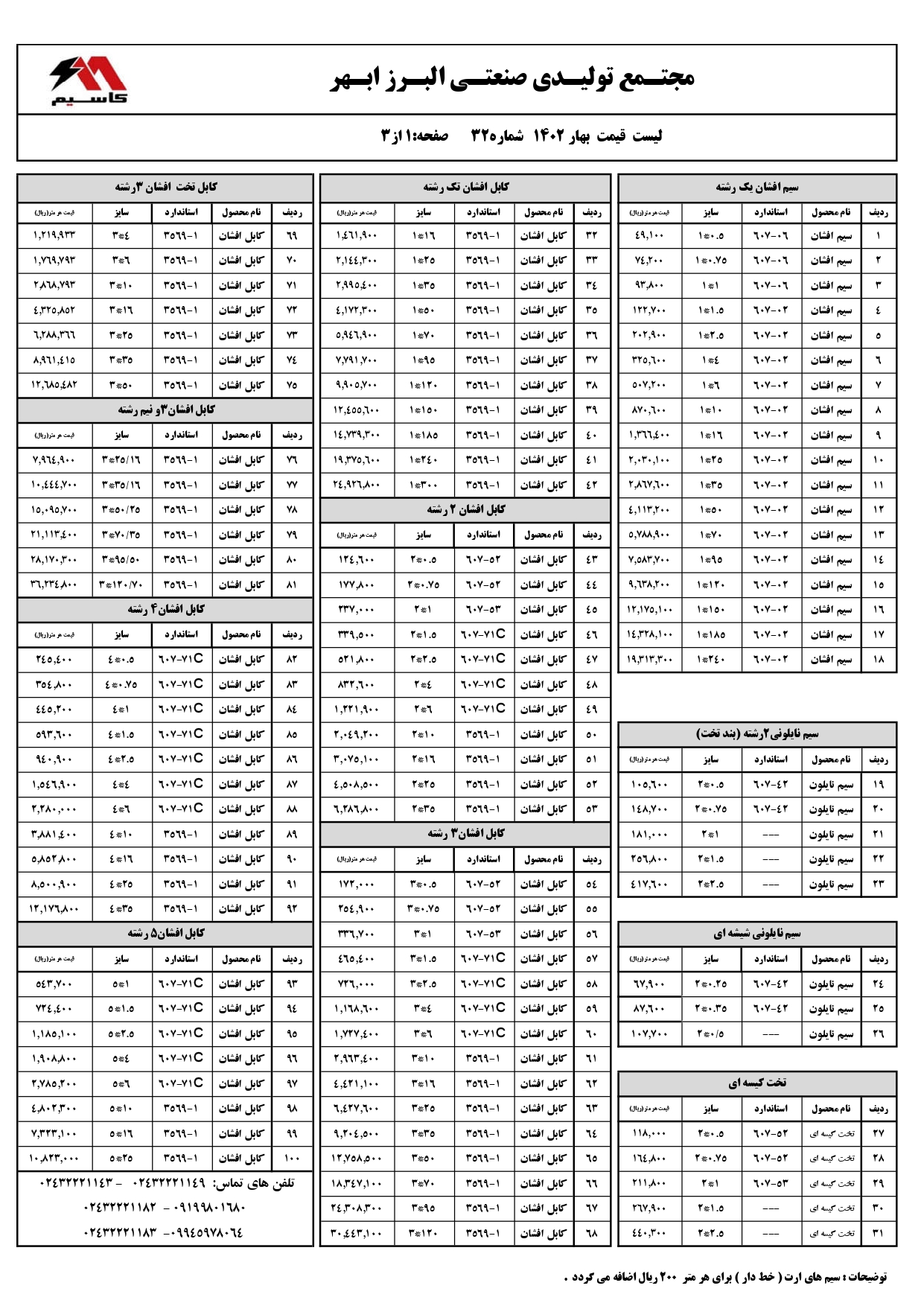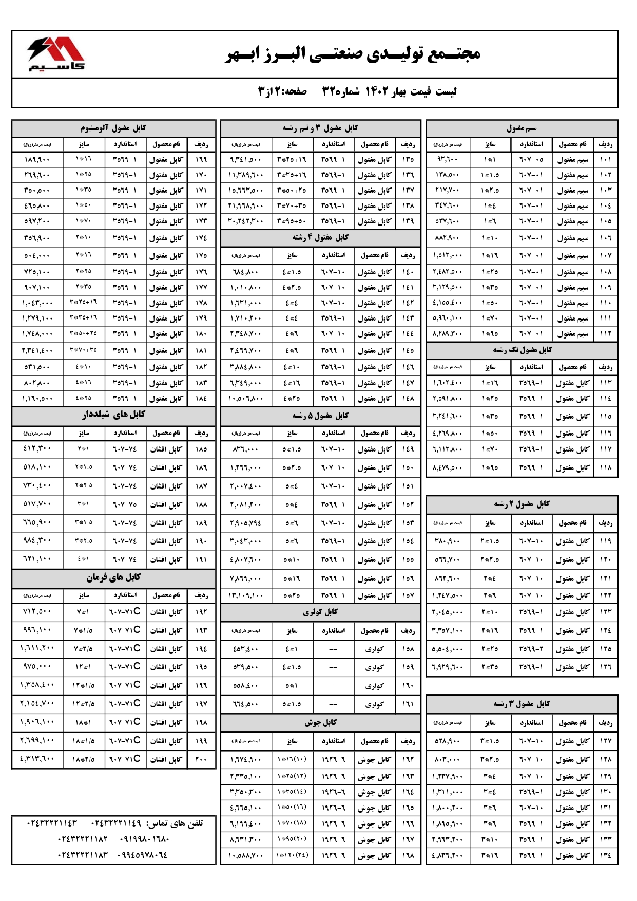 برای اطلاع از آخرین قیمت سیم و کابل آلمینیومی، نایلونی، تخت، آنتن، کولر، کابل جوش و … تماس بگیرید.